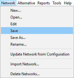 When you have finished defining an alternative, save it by selecting Save from the Alternative menu of the Alternative Editor, as shown in "Figure: Reservoir Network Module - Network Menu - Save Network".