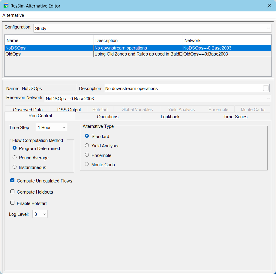 Each alternative represents the combination of a reservoir network, a selection of one operation set per reservoir, the specification of the initial conditions of each reservoir, and the selection of inflows and other input time-series datasets needed by your model. An Alternative consists of a Reservoir Network (previously created from a Configuration), Run Control specifications, an Operation Set for each Reservoir in the network, a Storage Balance Operation Set for each Reservoir System in the network (if applicable), a definition of initial (Lookback) conditions, and a mapping of all Time-Series records to identified local inflows. To develop an Alternative, you use the Alternative Editor to name the Alternative and give it a description, define the Time Step and Flow Computation method, select Reservoir Operation Sets, select System Operation Sets (if applicable), select a Lookback Type, associate time-series data with locations, associate observed data with locations, and save the Alternative you have created. This chapter will guide you through these steps.