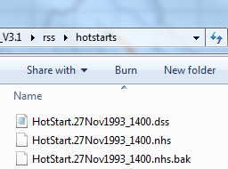 After simulating an alternative (e.g., "HotStart") that creates Hotstart files, a hotstarts folder is created in the rss folder of the watershed and contains two types of files corresponding to the selected Hotstart options: These files have extensions of "dss" and "nhs" and are named based on the selected Hotstart option(s). "Figure: Hotstart Files" shows the watershed folder's file system after a folder named hotstarts was created that contains two files whose names are based on the options shown in "Figure: Alternative Editor - Create Hotstart File" (for this example, the Hotstart files reflect a Date and Time of 27Nov1997 at 1400 hours).