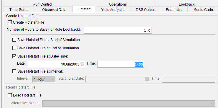 To use the Hotstart option, you must first run a simulation that saves system state data to "Hotstart" files. You may create one or multiple Hotstart files from a single simulation, differentiated by the dates saved in the hotstart files. Each of those files can be used to inform an alternative of starting state data, but only one Hotstart file can be used by an alternative. The Hotstart file used is selected by setting the using alternative's simulation start date to correspond to the Hotstart date. The alternative then uses a Hotstart file, rather than Lookback data to determine initial conditions.