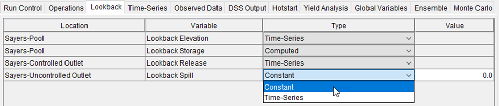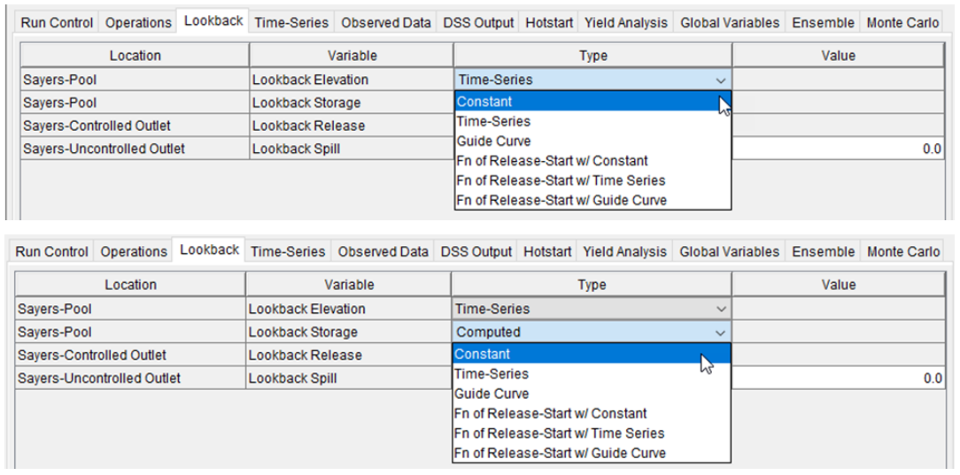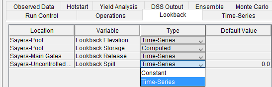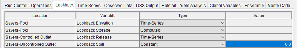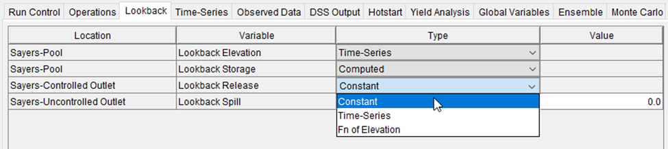 For each location (Reservoir) depending on the parameter (Pool, Controlled Outlet, Uncontrolled Outlet), in the Type column there are different options available from the dropdown list to define the lookback.