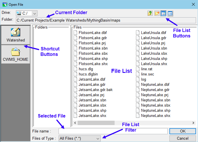 Each file browser will have its own potential list of file type filters. The All Files option will be in the filter lists and equates to “no filter” so that all files in the current folder are lists. The default filter in each browser will be the file type that the specific browser was intended to help you locate and select. For example, the Open Watershed file browser defaults to Watershed Files, which means that it is filtering for files with the extension: .wksp.