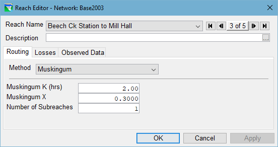 Reaches route water through your reservoir network by employing a hydrologic routing method. Use the Reach Editor ("Figure: Reach Editor") to specify routing method, the routing parameters, and the loss rates for each of your reaches.