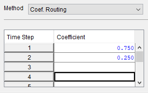 If you enter a coefficient of 1.0 in the first row of the Coefficient Routing table and leave the rest of the table blank, you have defined a Null or instantaneous routing reach — all the flow entering the reach will exit the reach in the same timestep.