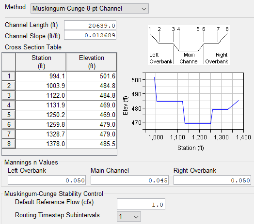 The edit panel for the Muskingum-Cunge 8-pt Channel Routing method is shown in "Figure: Muskingum-Cunge 8-pt Channel Routing Edit Panel". This panel includes a generalized illustration of an 8 point cross section to provide a guide for defining the cross section. Below the illustration is a thumbnail plot to show your cross section as defined in the Cross Section Table. Use the thumbnail plot to verify that your cross section points were entered correctly and adequately reflects the cross section template shown in the illustration.