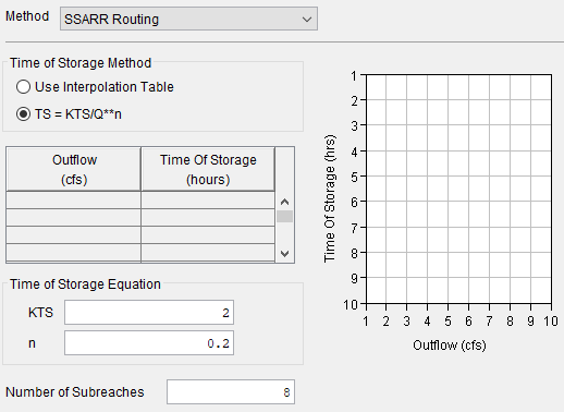 The SSARR routing method ("Figure: Reach Editor - SSARR Routing Method") is an implementation of the channel routing method used in the computer program Streamflow Synthesis & Reservoir Regulation (SSARR) developed the Corps' Northwestern Division (USACE, 1991) and NOOA's North West River Forecast Center.