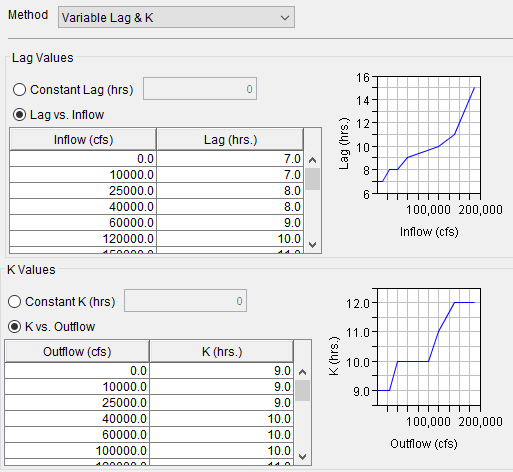Lag vs. Inflow—The Lag vs Inflow table is why the method is called "Variable". Use the Lag vs Inflow table to describe the relationship between Inflow and travel time.