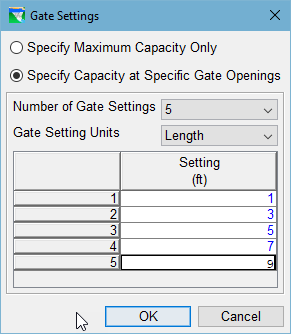 Click Edit Gate Settings to access the Gate Settings dialog ("Figure: Controlled Outlet Specifying Gate Settings"). Gate settings are sometimes known as "cranks." Choose either Specify Maximum Capacity Only (the default) or Specify Capacity at Specific Gate Openings.