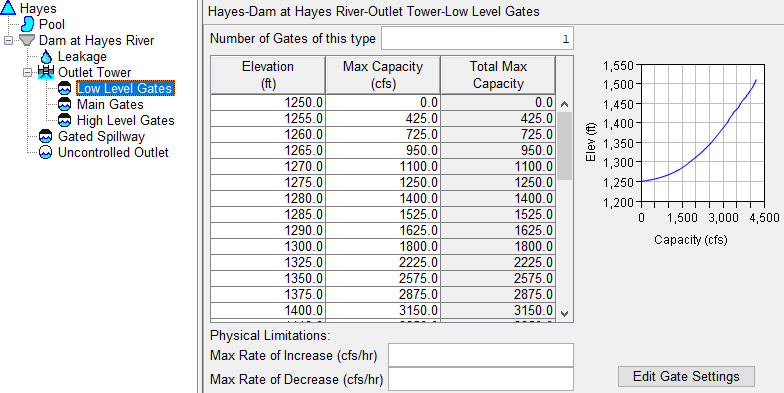 Note: Even though you can enter the appropriate Gate Settings, ResSim does not currently make use of this information in most of its operations. It will, however, produce a time series of gate settings as output based on the final release from the outlet. The exceptions are the induced Surcharge and Prescribed Release rules.