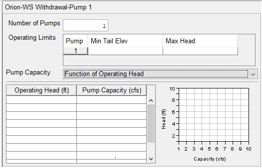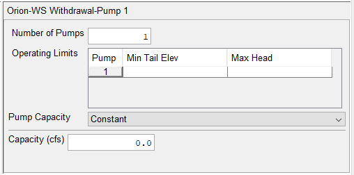 Number of Pumps—Think of a pump outlet as a "Pump Station" in which one or more pumps operate together to meet the pumping objective. Enter the number of identical pumps in the pump station. This value will add rows the Operating Limits table, one for each pump, and will be used as a multiplier on Pump Capacity to determine the total rate at which the pumps can move water.