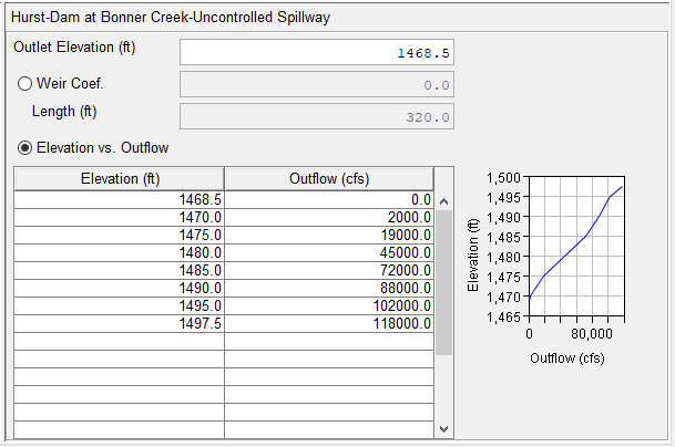 Whether you use the weir equation or the Elevation vs Outflow table, you must specify an Outlet Elevation. The Outlet Elevation serves as a trigger to determine when this outlet starts "flowing."