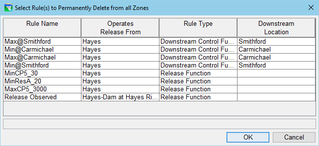 The selected rule(s) will be deleted from all zones and operation sets of the current reservoir in the current network. In addition, downstream control and/or system hydropower rules will be deleted from all zones and operation sets of all reservoirs in the current network that used those rules.