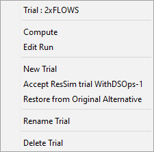 Trials can be reset to the original conditions of their parent alternative by right clicking on the Trial in the Simulation Control Panel and selecting Restore from Original Alternative ("Figure: Simulation Control Panel Context Menu - Trials"). Alternatively, a trial can replace its parent alternative by selecting Accept ResSim trial.