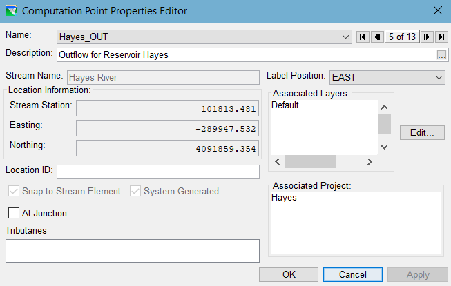System Generated: ResSim automatically generates computation points for the watershed when you create certain project elements. The System Generated checkbox will be checked if the computation point has been generated with a project element. This checkbox is not editable. If checked, the relevant project should be listed in the Associated Project field.