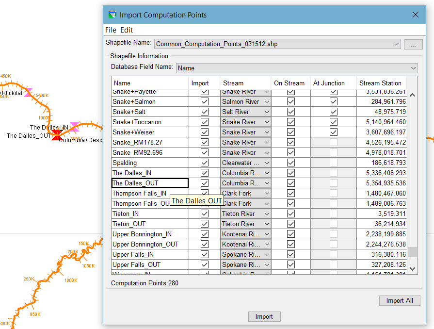 - Select the attribute in the Database Field Name selector that identifies the individual computation points. The table will fill with information about the points in the shapefile including the value of the selected attribute in the Name column, the stream in the Stream Alignment that it will import to, whether the point is at a stream junction in the Stream Alignment, and its stream station.