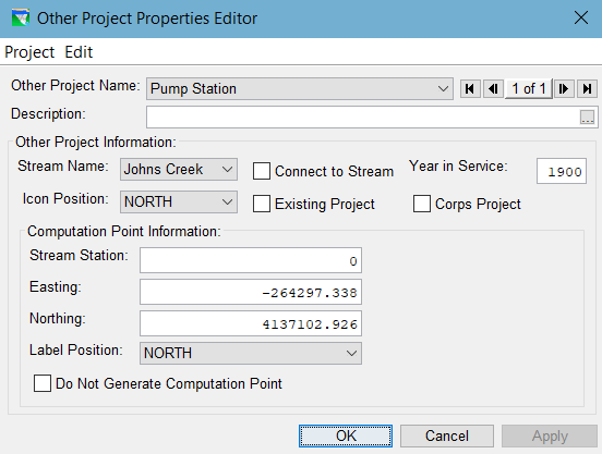 Other project is a catch-all name for a man-make features in the watershed related to the movement of water. Possible other projects might include pump stations, in-line spillways, or even an ecosystem restoration project. ResSim does not use other projects but you should consider carefully whether the other project you are considering adding to the watershed could be modeled with a reservoir or a diversion—such as a pump station.
