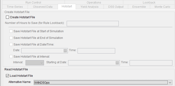 To use the Hotstart option, you must first run a simulation that saves system state data to "Hotstart" files. You may create one or multiple Hotstart files from a single simulation, differentiated by the dates saved in the hotstart files. Each of those files can be used to inform an alternative of starting state data, but only one Hotstart file can be used by an alternative. The Hotstart file used is selected by setting the using alternative's simulation start date to correspond to the Hotstart date. The alternative then uses a Hotstart file, rather than Lookback data to determine initial conditions.