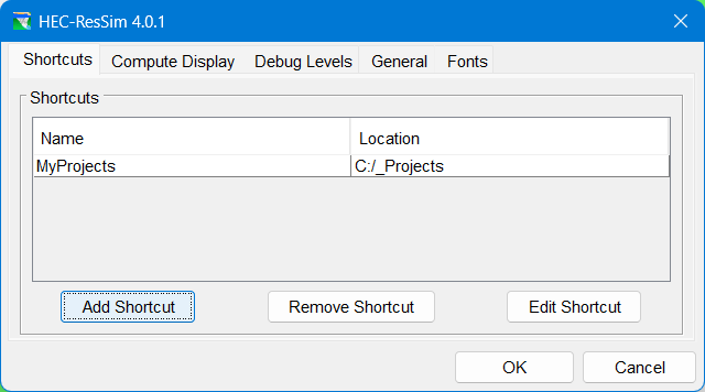 - Click OK to finish creating your shortcut and close the Add Shortcut dialog. The new location/shortcut will now appear in the list of Shortcuts on the Shortcuts tab. Refer to "ResSim Application Settings" for information about other options available in the Options dialog.