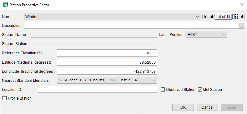 By default, when a water quality station is added to the map schematic, it is set as a meteorological station. However, the user can configure the station to be either an Observed Station, or both a Met and Observed Station, from the Station Editor (Station Editor – Configure Water Quality Station -Met station).