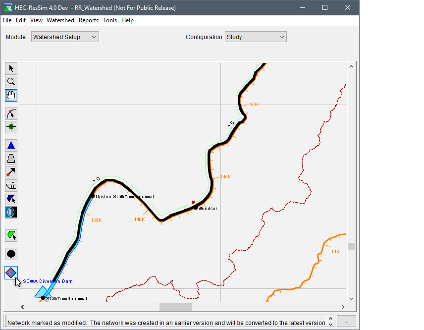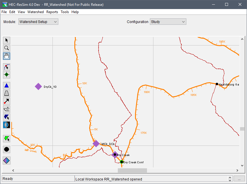 1) From the HEC-ResSim main window, navigate to the Watershed Setup module. 2) In the Toolbar, select the Station Tool