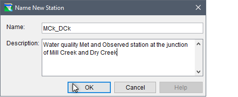If the selected location along the stream alignment is not a CCP, a meteorological station (Met Station) will be placed by default at that location, and the Name New Station dialog (Name New Station – Create New WQ Station) will open.