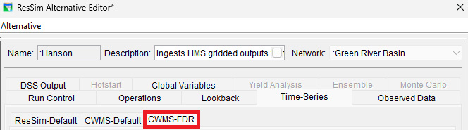 If a new program order is created, a new Time-Series tab appears in the ResSim Alternative Editor. Verify the pathnames in this tab are correct before proceeding.