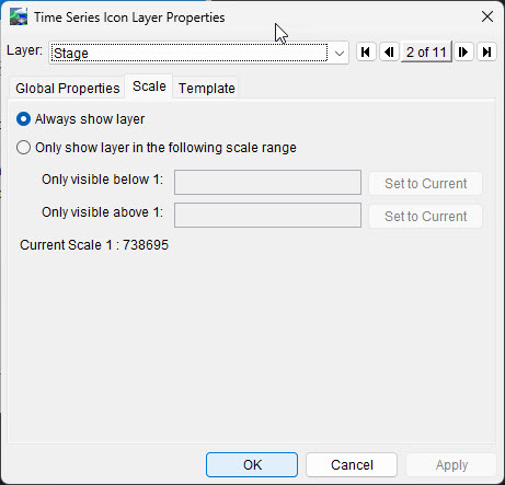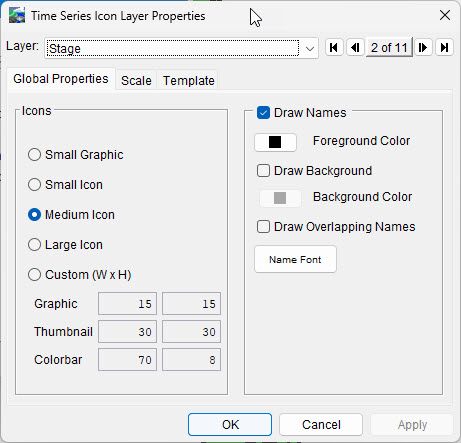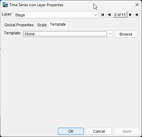 HEC-RTS allows you to configure the appearance of time series icons, their labels, the visualization scale, and associate a template using the Time Series Icon Layer Properties dialog.