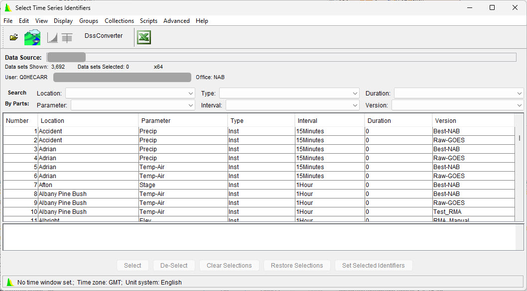 - The Select Time Series Identifiers dialog will open, displaying data from your source.