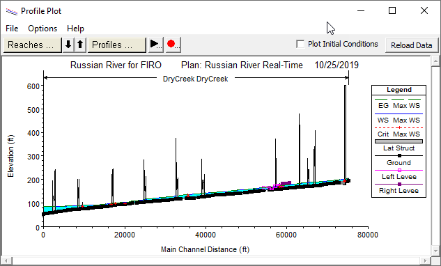 From the File menu you can copy the plot to the clip board and print. - In the Options menu, you are given the options to zoom, pan, and animate; choose what plans, profiles, and reaches that are displayed in the plot; set the elevation to lateral width ratio; and manipulate the plots settings which include axis labels, lines, symbols, grid, zoom window location, and WS order. See the HEC-RAS User's Manual for more information.