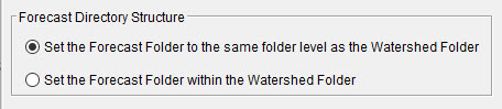 By default, the forecast directory structure for a watershed in CWMS places the Forecast Folder in the same folder level as the Watershed Folder. If you wish to change that, you may toggle the option to allow the Forecast Folder to reside within the Watershed Folder.