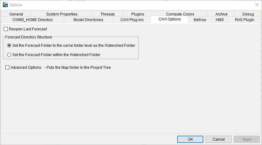 To have CWMS automatically open the last forecast that you had open during a previous CWMS session, check the box next to the Reopen Last Forecast option. Click OK, the Options dialog will close, and the next time you open the watershed, the active forecast will be automatically opened.