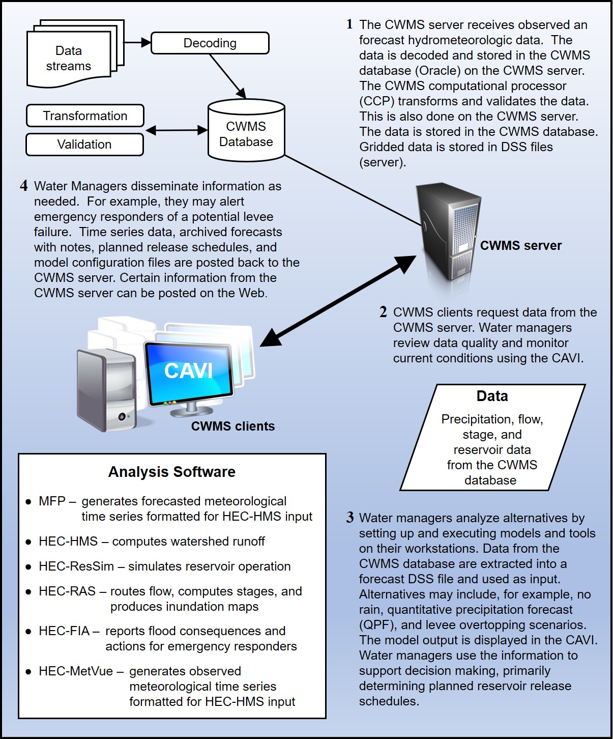 The CWMS software has a mechanism that links the selected analysis software for a forecast, so that the selected software applications are executed in an orchestrated manner. Data and other inputs are passed between software applications through the HEC-DSS data exchange software. The available analysis software in CWMS meets modern software standards, including an easy-to-use GUI, and executes within operating systems selected by USACE. The analysis software available in CWMS is: