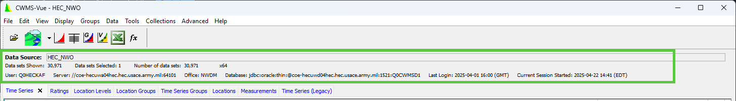 The File Information panel displays the filename or database and path of the opened file/database. If you are connected to a database, it will display the office as well as the last login and the start time of your current session/ login. In addition it displays statistics about the pathnames in the file and the size of the file or number of data sets in the CWMS database or HEC-DSS file.