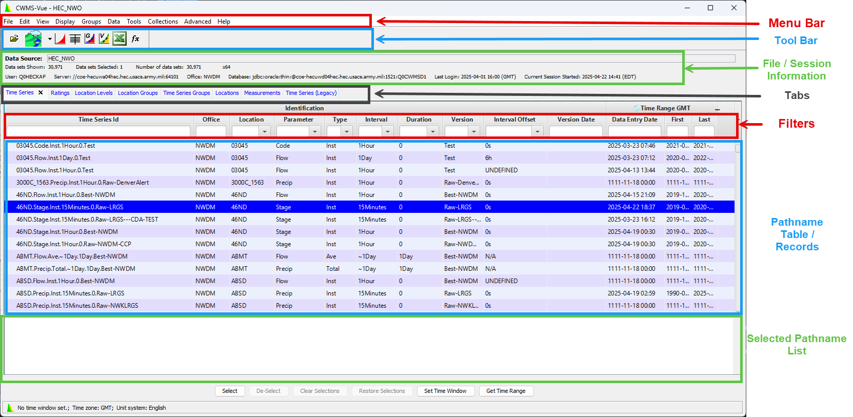 From the CWMS CAVI main window, from the Tools menu, point to Applications, click CWMS-Vue, and the CWMS-Vue dialog will open. The Menu Bar contains the menus for CWMS-Vue, following is a description of the available menus.