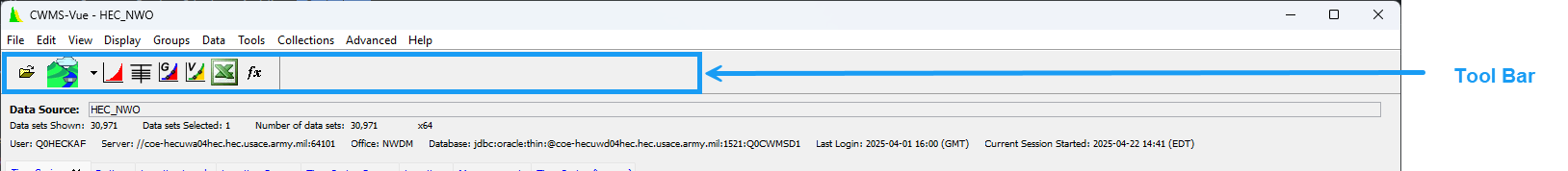 TheToolbar contains buttons that provide you with the capability to open a DSS or CWMS database file, plot the data, edit the data in a table, edit the data from a graphical editor, and apply math functions to the data. These buttons provide a shortcut to the respective commands in theDisplaymenu.
