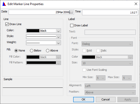 You can edit the line style and label of a marker through this worksheet. The Edit Marker Line Properties editor is shown below The Marker Line tabs in the Plot Properties editor and the Default Plot Properties editor use similar worksheets as well.