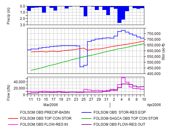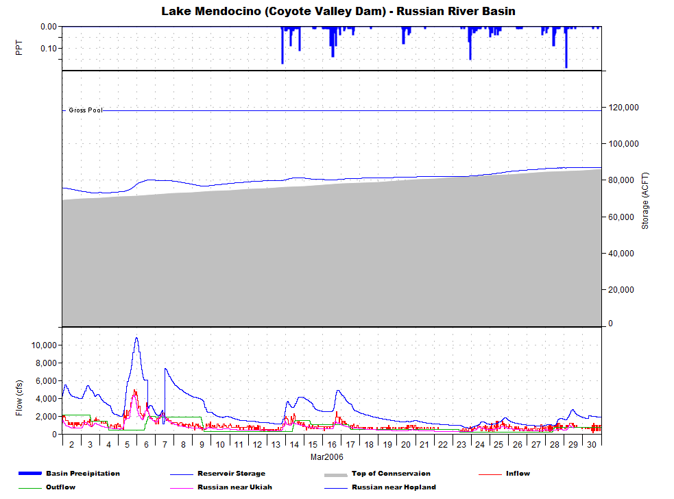 | Coyote Valley Dam Reservoir Plot | Coyote.py | This is a plot showing reservoir data for the month of March. The plot shows precipitation, storage, top of conservation, inflow, outflow and downstream flows.