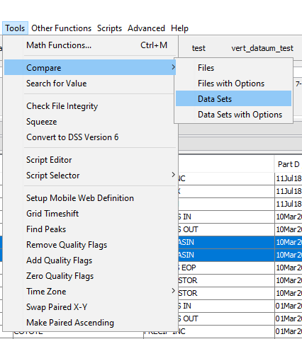 The compare feature under the Tools menu (shown below) has features to compare DSS Data Sets.
