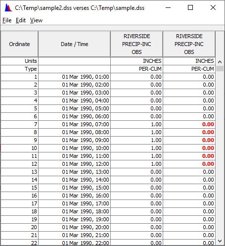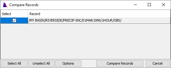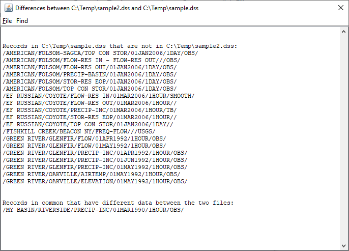 Two HEC-DSS files can be compared to determine the differences of records contained in each file. This is useful in determining if a new version of a program gives the same answers as an older one. Individual or groups of records within the HEC-DSS files can be compared to determine the differences between their data. Options to compare are found under the Tools->Compare command.