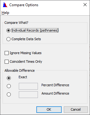 6. The Compare Options dialog box (below) allows you to set options to compare values by ignoring missing values (where both values are non-missing) for the same times, compare values for coincident times only (where there are valid values in both data sets at the same time), and set a tolerance to compare between numbers. For the tolerance, you can set a percent amount that values can differ by or an absolute value that they can differ.
