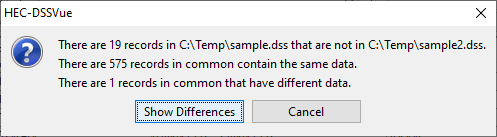 3. A message box will display (see below) , summarizing the number of records contained in both of the HEC-DSS files. To view a list of the different records, click Show Differences.
