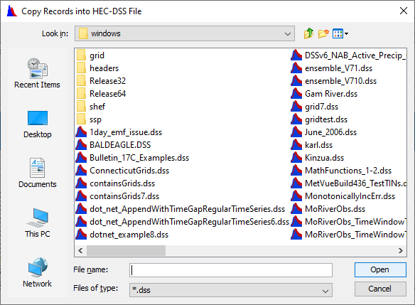 3. In the File name box, type in a new HEC-DSS filename or select an existing HEC-DSS File you want to copy the record into and click Open. A confirmation message will appear stating that the record has been copied to the HEC-DSS file you selected.