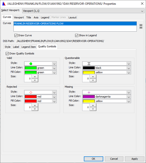 2. Select a symbol Style, Line Color, Fill Color, and Size for each quality of data; Valid, Questionable, Rejected, and Missing.
