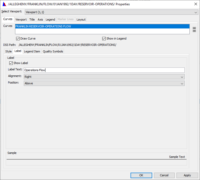 The Curves tab of the Plot Properties editor and the Edit Curve Properties editor are nearly identical with one exception. At the top of the Curves tab of the Plot Properties editor, there is a list of all curves contained in the plot. In contrast, when you open the Edit Curve Properties editor, only the selected curve's DSS Path is displayed. Both the Edit Curve Properties editor and the Curves tab of the Plot Properties editor allow you to edit Style, Label, Legend Item, and Quality Symbols (you can edit Quality Symbols only if the plot has quality defined data).