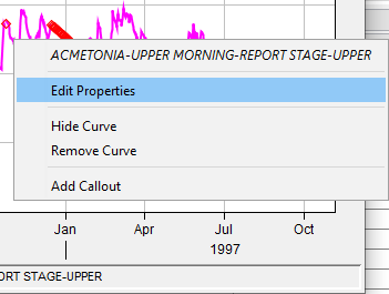 To customize a specific curve in an individual plot, right-click on the line or curve you wish to edit using the Pointer Tool , then select Edit Properties from the shortcut menu (see below). The Edit Curve Properties editor will open.