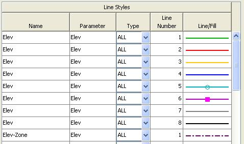 - Line Number The Line Number column indicates the number of lines/curves displayed in the viewport and what style will be associated with that data. For example, if you have three curves in a viewport each with the same Name, Parameter, and Type, the first line will be assigned the Line/Fill associated with Line Number 1; the second will use Line Number 2, the third Line Number 3, and so on. If there is only one line displayed in the viewport for that data set, it will use the Line Number 1 line style. See Adding New Data Styles below to add more Line Numbers to a particular data set.
