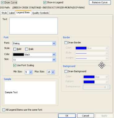 By default, the curves display their DSS Pathnames inside the legend. However, the legend labels, named Legend Items, can be customized for individual curves.