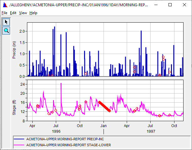 The Zoom Tool allows you to "zoom in" and view data more precisely at smaller time intervals. To zoom in, first select the Zoom Tool, then hold the left mouse button down and pull down to the right forming a square around the area you wish to zoom in to. The plot will redraw, magnifying the area in the square when the mouse key is released. Right-click to zoom out or from the View menu, click Zoom to all.