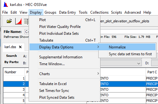 Two options are provided as a quick way to compare time series data sets for different time periods or for different amounts. The options are turned on or off by selecting and un-selecting them from the Display menu, point to Display Data Options, and the two available options are - Normalize and Synch data set times to first.