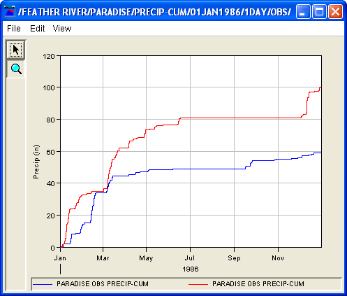 Each option will remain on until you turn it off or the program exits. The options can be used in combination with each other. For example, if you want to compare cumulative precipitation curves for different years, set each option to on. The figure below shows such an example of normalized cumulative precipitation for years 1986 and 1995, synched to the same start time.